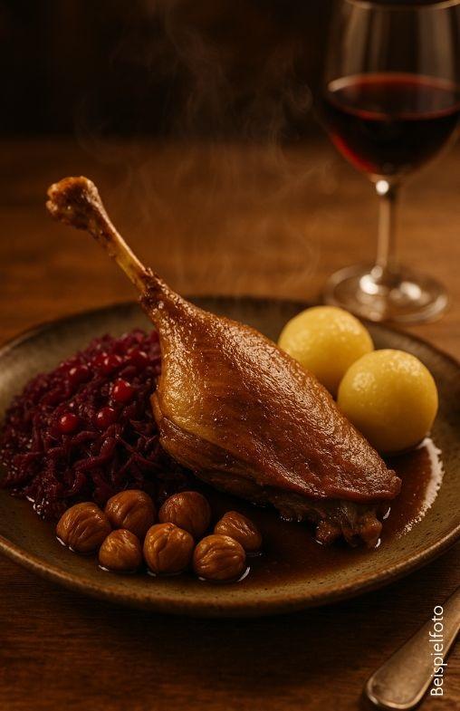 Zu diesem herbstlichen Gänsemenü empfehlen wir einen samtigen Spätburgunder oder einen kräftigen Merlot aus unserer Weinboutiqe Vinomeet – beide unterstreichen das Aroma der Gans und die feine Süße des Rotkohls perfekt. Wer es lieber heller mag, findet im Grauburgunder den passenden Begleiter. Wir beraten Sie gerne am Tisch.