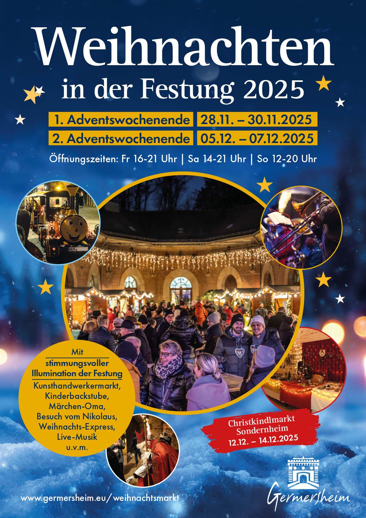 In der Festungsstadt Germersheim findet der stimmungsvolle Weihnachts- und Kunsthandwerkermarkt im historischen Innenhof „Hufeisen“ sowie in den Gängen der ehemaligen Festungsanlage „Fronte Beckers“ aus dem 19. Jahrhundert statt. Der Weihnachtsmarkt in Germersheim zählt zu den stimmungsvollsten Märkten der Südpfalz und begeistert jedes Jahr viele Besucherinnen und Besucher mit seinem besonderen Ambiente. Das als Kulturzentrum etablierte „Hufeisen“ erfreut sich großer Beliebtheit bei Einheimischen, Touristen und Gästen. Mit seinem einzigartigen historischen Ambiente bietet es die perfekte Kulisse, um die Festungsstadt Germersheim weit über die Region hinaus bekannt zu machen. Der familienfreundliche Weihnachtsmarkt mit seinem abwechslungsreichen Begleitprogramm, darunter Livemusik, begeistert Besucher am ersten und zweiten Adventswochenende. Zahlreiche Lichter, festlich geschmückte Buden und der Duft von Glühwein schaffen eine zauberhafte Atmosphäre. Für die Kleinsten gibt es eine Kinderbackstube der Lokalen Agenda, in der Kinder gemeinsam mit ehrenamtlichen Helfern kostenfrei Plätzchen backen können. Erleben Sie das festlich geschmückte Germersheim, den Lichterzauber in der Festung Fronte Beckers und genießen Sie „Weihnachten in der Festung Germersheim“ – ein echter Geheimtipp für Weihnachtsmarkt-Fans aus nah und fern!