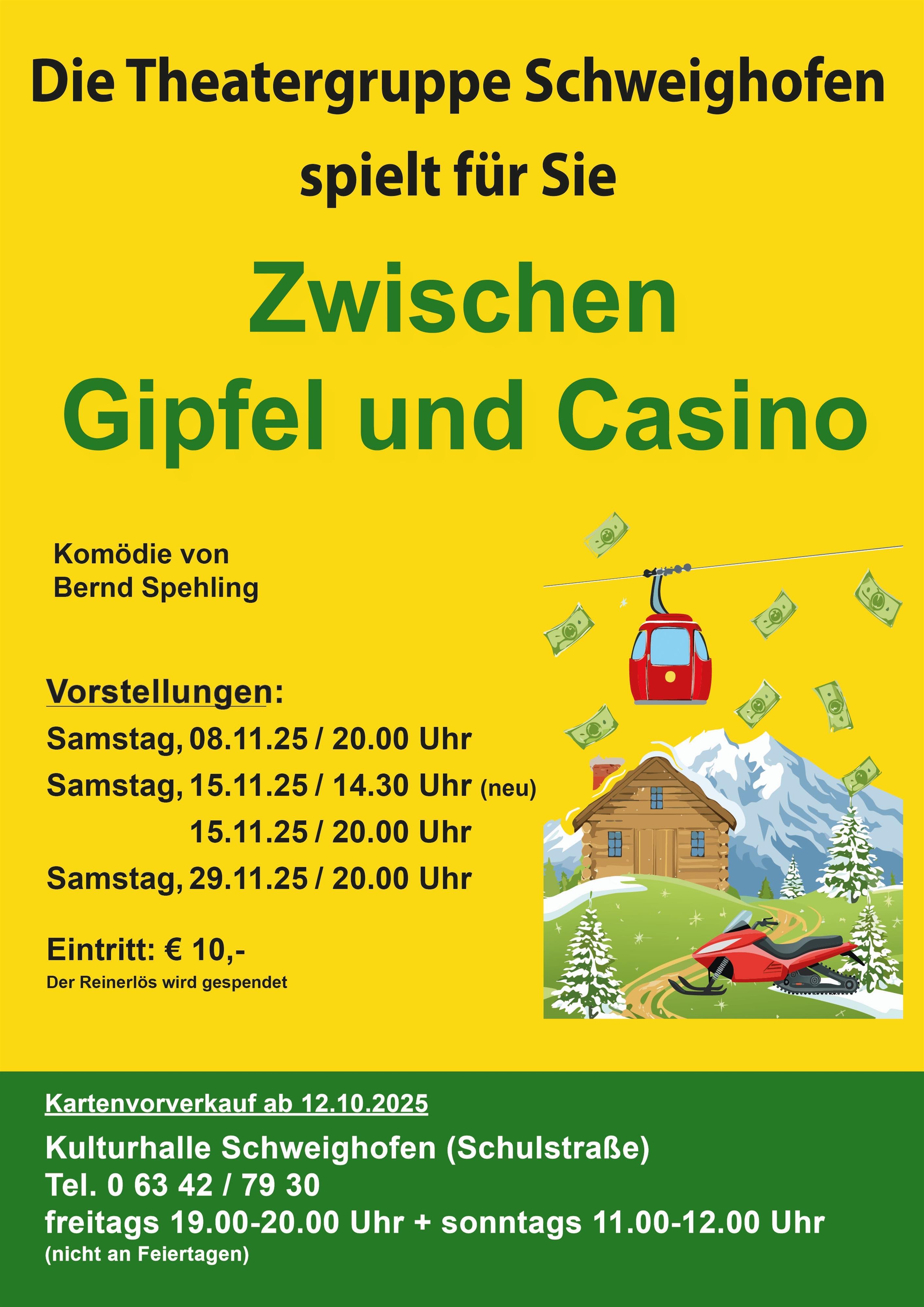 Die Theatergruppe Schweighofen spielt für Sie „Zwischen Gipfel und Casino“. Eine Komödie von Bernd Spehling.